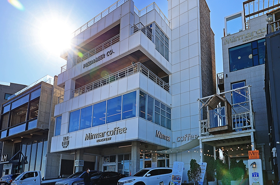 안목 바닷가 커피거리에 있는 오션뷰 미르마르 카페는 뷰 맛집으로 유명하다. 루프탑과 테라스에 인생 샷을 찍을 수 있는 포토존으로 꾸며져 있다. 독특하게 빈백이 놓인 테이블이 있어서 바다를 보면서 누워서 쉴 수 있어 인기가 많다. 탁 트인 안목 해안을 바라보면서 음료를 즐기기 편하다. 강릉 명물인 커피콩 빵을 비롯한 다양한 디저트도 준비되어 있다. 노키즈존으로 운영하고 있지만 보호자와 함께 입장할 수 있다.