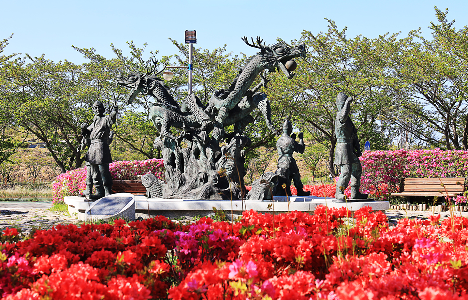 영랑호 설화공원은 영랑호에 얽힌 설화를 조각상으로 재현한 공간이다. 공원에 들어서면 파도 위에 솟아오른 두 마리 용이 보인다. 용 주변으로 네 명의 화랑이 보이는데, 이곳 호수에서 수련했다고 하는 화랑 영랑의 모습을 형상화한 것이다. 영랑은 이곳 호수에서 수련하다가 불교의 관음보살을 직접 만났고, 관음 바위로 불리는 이곳에서 마침내 승천했다는 이야기가 전해진다.