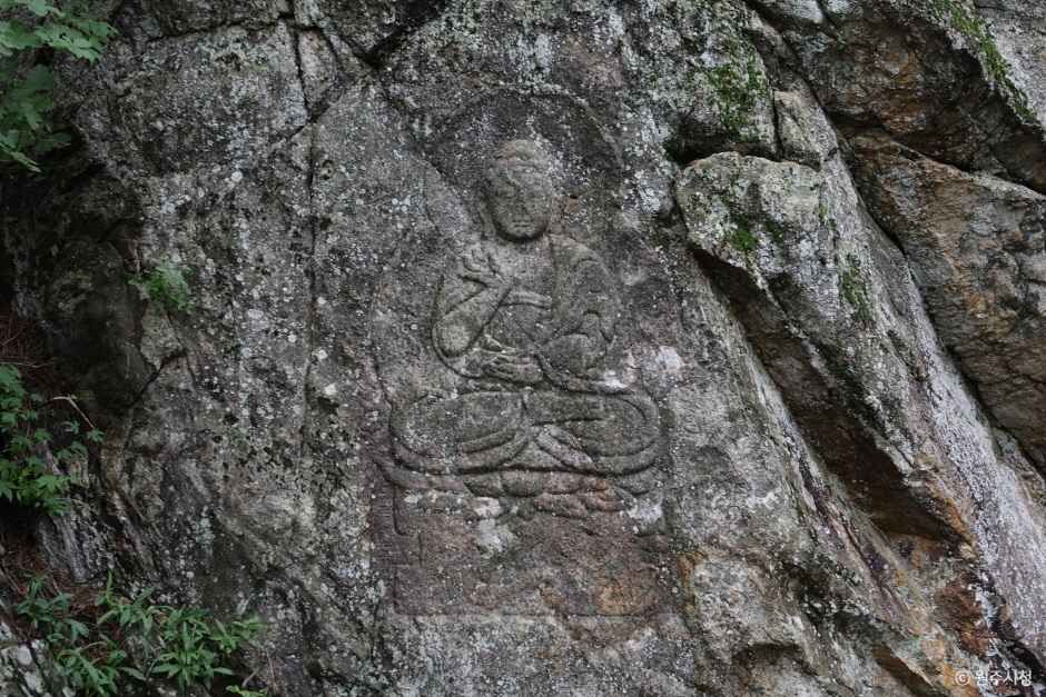 원주시 소초면 흥양리 산1번지의 입석사 위에 있는 입석대로부터 서북방 약 30m 지점의 암벽에 있는 좌상으로 입석사에서는 가장 오래된 석조물이다. 입석사 바위에는 많은 수의 이름이 각자 되었고 아래에는 근래에 신축된 대웅전과 산령각이 있으며, 그 아래에 요사체가 있다. 입석사지는 처음에 신라 의상대사가 이 곳에 토굴을 짓고 수도했다는 구전이 있을 뿐 다른 문헌이 없어 절의 내력을 알 수 없다. 불상의 총고는 86㎝, 단고는 24㎝, 어깨 폭이 40㎝ 이며, 뒤쪽에는 두광과 신광을 나타냈고 결가부좌하고 있다. 하단부에는 아래는 단엽의 양련으로 된 연화대를 받치는 좌대를 음각하였다. 머리부분은 완전히 양각되었고 아래는 선각으로 나타냈다.
