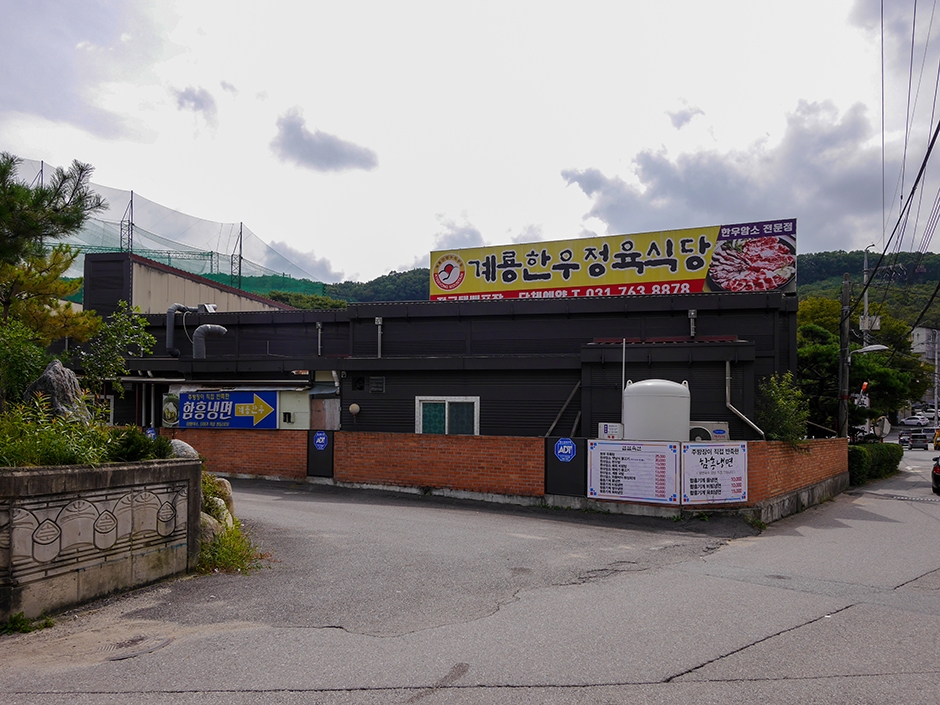 계룡한우는 중대물빛공원 근처에 있는 한우정육식당이다. 단독건물로 건물 앞에 넓은 주차장이 있어 편하게 주차할 수 있다. 깔끔하고 넓은 내부에 테이블이 많고 룸이 있어 회식 및 단체모임을 할 수 있다. 한우 암소 전문 직판장과 함께 있는 이 식당은 옆에 직판장에서 고기를 직접 골라서 구매 후 식당에서 이용료를 내고 구워 먹는 시스템으로 되어 있다. 구이 외에도 한우육회, 비빔밥, 한우 차돌박이 된장찌개 등 한우 암소를 원재료로 한 식사 메뉴가 다양하게 준비되어 있다. 매장 한쪽에는 부족한 반찬을 추가로 이용할 수 있는 셀프바가 준비되어 있다.