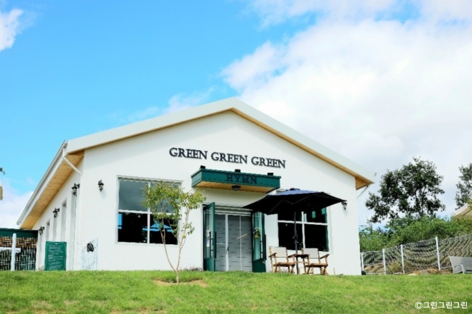 그린그린그린은 포천시 신북면에 있는 디저트 카페이다. 산, 나무, 잔디로 둘러싸인 시골 마을에 있는데 주위가 모두 초록이다. 마당에는 꽃도 많아 공기 좋고 보기도 좋다. 반려동물을 동반하면 실내에서는 하네스를 하고 있거나 안고 있어야 하고 야외에서는 풀어 놓고 있을 수 있다. 반려견이 실내를 이용할 때는 입장료를 내야하고, 지켜야 하는 규칙이 있으니 미리 확인하고 방문하는 것이 좋다. 반려동물에게도 연어랑 오리간식, 강아지 퍼푸치노 볶음밥 등 음식을 제공한다. 음료와 빵을 주문하는 공간은 반려동물이 접근하지 못하도록 분리되어 있다. 야외 공간은 2~3가지 공간으로 나누어져 반려동물들이 실컷 놀 수 있도록 준비되어 있다. 외부에는 반려견들을 위한 배변패드나 강아지 물통이 있다. 반려견을 위한 배려와 준비가 반려견 카페 수준이다. 하지만 반려동물을 동반하지 않는 손님도 많다. 자연을 감상하며 커피를 마시기도 좋은 곳이다. 시그니처 메뉴인 바닐라빈 라테가 인기가 좋다. 음료나 디저트 가격도 교외의 대형 베이커리 카페에 비해서 합리적이다. 자동차를 이용하는 손님이 많지만, 전용 주차장이 두 곳이나 있어 이용이 편리하다.