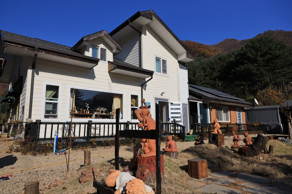 김명희 갤러리는 산촌생태마을 체험관 숲 속 학교 아래 계곡에 걸쳐 있는 작은 다리 하나를 건너면 바로 오른쪽에 위치하고 있다. 하얀색의 외관과 잔디밭이 멀리서도 눈에 띄는 조형스튜디오는 입구부터 눈을 즐겁게 한다. 마당 가득 작가의 테라코타 작품들이 전시되어 있다. 우리나라를 대표하는 흙공예작가 김명희 선생의 작업 공간이자 전시공간인 김명희 조형 스튜디오이다. 김명희 선생은 중국 민간 공예 특급 대사 ‘위청청’ 선생에게 사사한 한국 유일의 제자로 흙공예 특히 흙으로 인형을 만드는 분야에서는 국내외에서 명성이 자자하다.