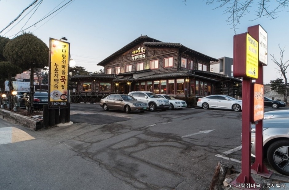 1997년에 문은 연 다람쥐마을누룽지백숙은 일산동구 애니골에 있다. 다람쥐마을 이름과 잘 어울리는 통나무 외관이 산장을 떠올리게 한다. 토종닭에 누룽지와 찹쌀, 국내산 한방재료 등을 넣어서 푹 끓인 보양식이다. 고양시 맛집으로도 선정이 되었다. 메뉴 중 ‘건강한 밥상’은 전반적으로 도토리요리와 다양한 음식을 골고루 먹을 수 있다. 식사 후에는 2층 카페에 준비된 커피와 차를 무료로 마실 수 있다. KBS 2TV 생생정보에 누룽지백숙과 도토리묵무침이 소개된 바 있고, 드라마 ‘빈센조’ 촬영장으로도 이용되었다. 근처 가볼 만 곳은 정발산공원과 달맞이 공원이 있다.