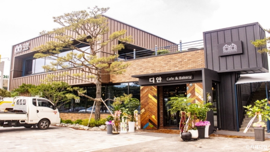 디안베이커리카페는 화성시 매송면에 있는 베이커리 카페이다. 유리로 만들어진 식물원이 있어서 카페에서 빵과 음료를 구매한 후 식물원으로 이동해서 빵과 음료를 먹는 경우가 많다. 빨간 벽돌로 만들어진 카페 내부도 넓고 우드톤 인테리어가 조화로워 쾌적한 분위기에서 음료나 빵을 먹고 싶은 고객은 카페 내부를 이용하기도 한다. 직접 만드는 베이커리는 종류가 다양하다. 과일 주스들은 물을 타지 않고 모두 과일 100%의 과일로 만들고 있다. 2층에 루프탑이 있어 밖을 조망할 수도 있다. 주차장은 전용 주차장 외에도 옆 매장과 같이 사용할 수 있는 공용 주차장이 있어 편리하다.