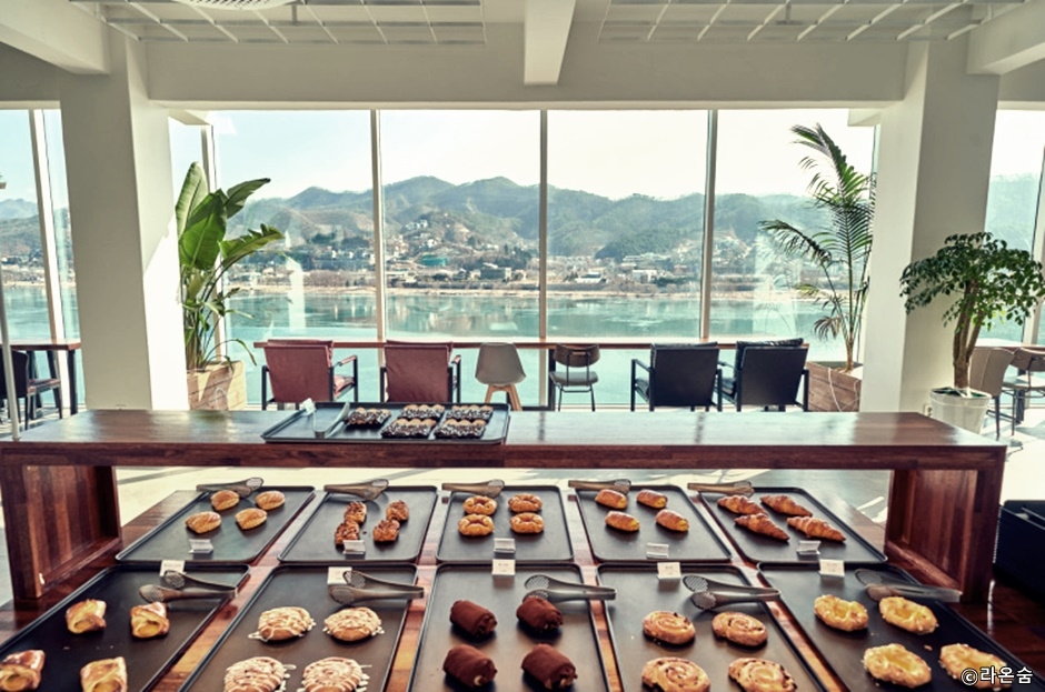 경기도 남양주시 북한강 서쪽에 있는 카페다. 라온숨은 우리말 즐겁다는 라온과 숨 쉬다는 숨을 합쳐 만든 말이다. ‘즐겁게 숨 쉬는 공간’이라는 이름에 걸맞게 다양한 식물뿐 아니라 카페 내부에 공기정화시스템을 갖춰 맑고 깨끗한 공기와 함께 즐거운 시간을 보내실 수 있다. 1층은 식물이 우거진 평상에 앉는 느낌의 좌식형 자리가 있고, 2층에는 베이커리 매대와 빈백의자가 있다. 3층은 갤러리로 젊은 작가 작품을 전시한다. 4층은 대관하는 곳으로 대관이 없는 경우 강을 배경으로 사진을 찍을 수 있다. 5층 캠핑관은 인조잔디에 텐트가 설치되어 캠핑 분위기가 난다. 통유리창으로 북한강을 볼 수 있도록 좌석이 놓여 있다.