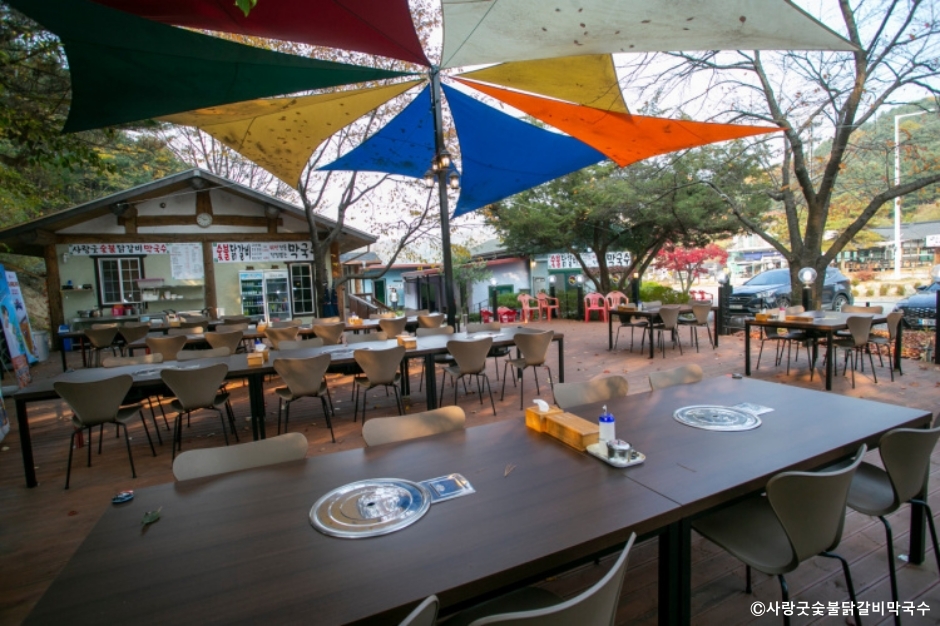 사랑굿 숯불닭갈비막국수는 가평군에 있는 막국수 닭갈비 전문점으로 오랜 전통을 자랑하는 맛집이다. 대표 요리는 막국수로 비빔 막국수, 물 막국수 중 하나를 선택할 수 있고, 겨울에는 막국수를 온 국수로 먹을 수도 있다. 닭갈비는 고추장, 간장, 소금 중에 선택할 수 있고 숯불로 초벌을 해서 제공한다. 닭갈비를 먹는 고객은 적은 양으로 나오는 후식 막국수를 주문할 수도 있다. 계절 메뉴로 만두전골과 손두부 버섯전골이 준비되어 있다. 풍광이 좋은 야외 좌석이 넓어 11월까지는 밖에서 식사하는 손님들이 많다. 주차는 매장 바로 앞에 가능하다. 주변에 리엔CC와 썬힐CC가 있어 골퍼들이 많이 찾는 맛집으로 아침고요수목원도 멀지 않은 곳에 있다.