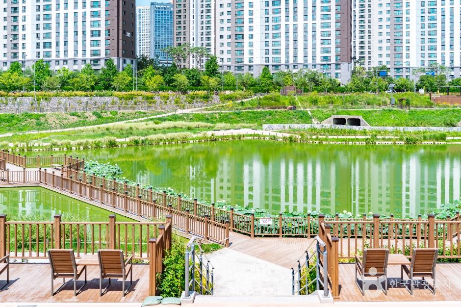 새빛공원 내 자경저류지는 호우 피해를 예방하고자 조성되었는데, 위기 시에는 방재의 기능을, 평상시에는 시민의 휴식기능을 담당하고 있다. 시민들의 휴식을 위해 철쭉, 코스모스, 왕벚나무, 억새 등 다양한 꽃과 나무를 심고, 물 위 데크로드, 지하수를 활용하여 수변공원을 조성했다. 이외에도 벤치와 그늘막을 설치해 휴식 공간을 마련하였고, 분수와 조명 등 다양한 볼거리도 준비되어 있다.
