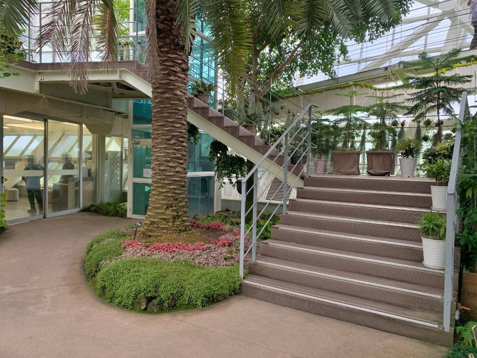 카페 내부는 1층과 2층으로 구성되어 있으며, 1층에서는 식물원을 바로 바라볼 수 있는 좌석이 인기 있다.