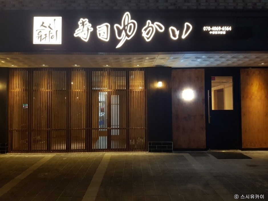 스시유카이는 일식집으로 다양한 메뉴의 초밥이 있다. 손님이 요리사에게 메뉴 선택을 온전히 맡기고 요리사는 가장 신선한 식자재로 제철 요리를 만들어 내는 오마카세 메뉴가 인기가 많다. 오마카세는 초밥뿐만 아니라 중간중간 국과 튀김류가 나와 질리지 않게 음식을 끝까지 즐길 수 있다는 점이 장점이다. 이곳은 미리 예약하고 가면 좋다. 주차는 매장 앞에 5대 정도 가능하다.