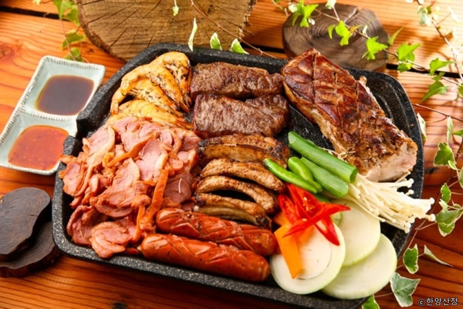 한양산장은 한양 CC가 있는 산자락 아래 있다. 대중교통을 이용할 경우, 인근 원흥역에서 버스를 이용하면 된다. 주차장은 넉넉하다. 녹음이 짙고 10,000㎡ (3,000여 평)의 넓은 공간에 커다란 천막이 있어 캠핑하듯 음식을 즐길 수 있다. 한우모듬세트를 비롯하여 삼겹살, 곤드레정식, 국수전골 샤부샤부 등 다양한 메뉴가 준비되어 있다.