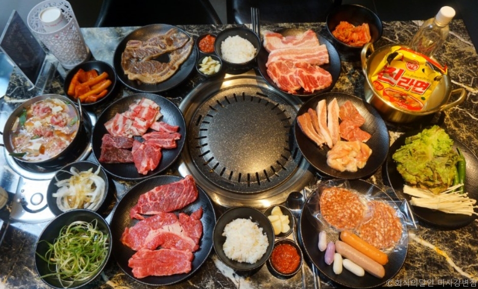 회식의달인은 무한리필 고깃집이다. 삼겹살, 항정살, 부채살, 새우살, 꽃등심, LA갈비 등 무려 20가지의 소고기와 돼지고기 부위를 무한리필로 즐길 수 있다. 또한 라면과 떡볶이, 공기밥도 무제한으로 먹을 수 있다. 100평급의 규모로 각종 모임과 회식장소로 안성맞춤이며, 아기의자와 아기식기가 구비되어 있어 가족외식을 하기에도 좋은 곳이다.