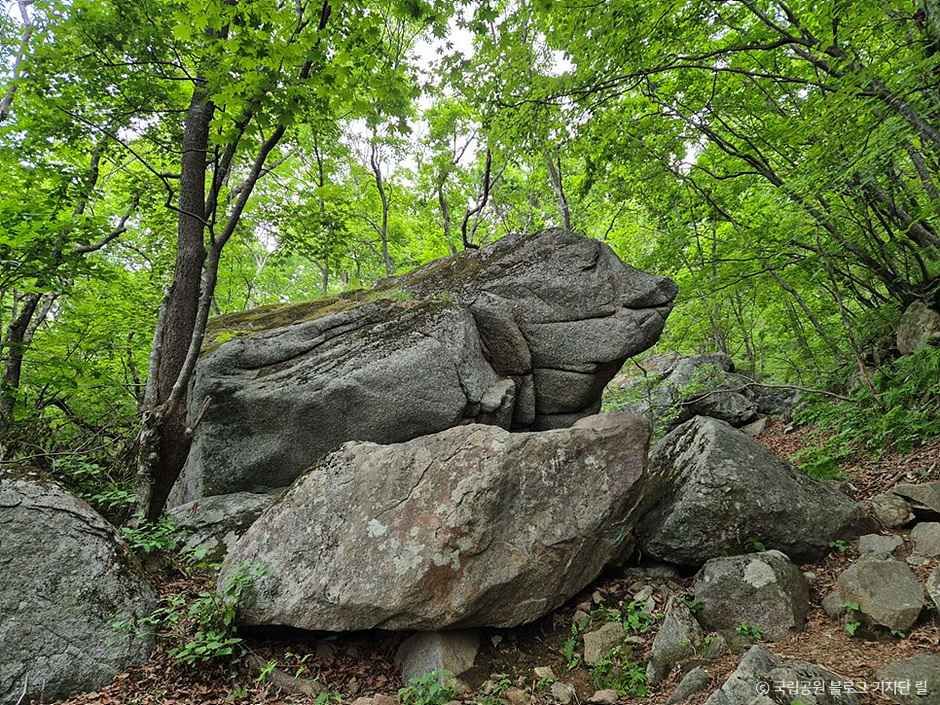 풍요와 다산을 상징하며 사람과 가장 가까운 곳에서 생활하는 동물로 인식되고 있는 돼지를 닮은 바위가 영주 소백산에 있다. 영주시 순흥면 초암사에서 국망봉으로 가는 탐방로 3.5㎞ 지점에 이르면 높이는 3m, 폭 2m, 길이는 5m 크기의 커다란 바위를 볼 수 있는데 바위가 마치 숲 속에서 한가로이 낮잠을 청하는 돼지의 형상을 하고 있다고 해 일명 ‘돼지바위’라 부른다. 지그시 눈을 감고 명상에 잠긴 듯 두툼하고 푸근한 옆모습이 영락없는 복돼지 얼굴을 한 돼지바위를 만지면 행운이 온다는 이야기가 전해지고 있다.