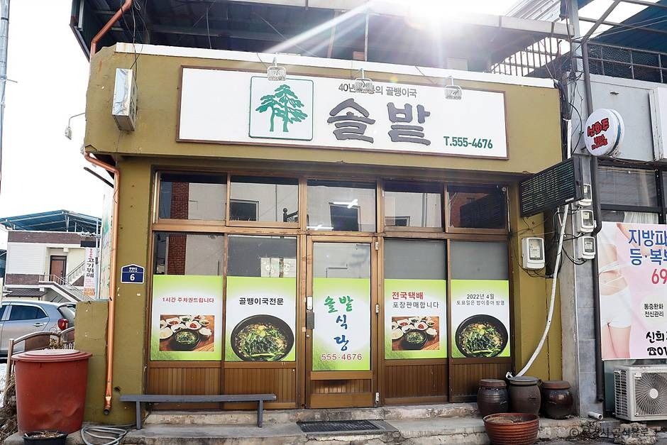문경시 점촌역 인근에 위치한 솔밭식당은 40여 년 이상 골뱅이국만을 전문으로 해온 한식당이다. 깊은 산속 깨끗한 환경에서 자란 골뱅이(다슬기)를 향토음식으로 자체 개발하였고, 맛으로 승부한다. 건강에 좋은 골뱅이국이 대표 메뉴이다. 아침 일찍부터 문을 열어서 아침식사로도 좋고, 점심이나 저녁 식사로도 좋다.