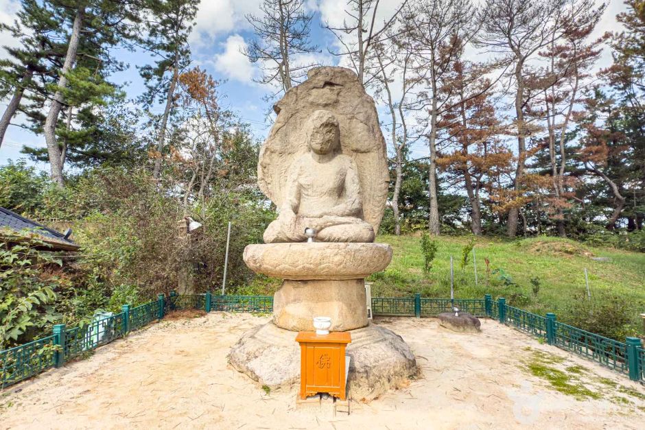 영지석불좌상 경상북도 경주시 외동읍 괘능리에 있는 석불좌상이다. 대좌와 몸 뒷부분에 조각된 광배가 있는 불상으로 광배 일부와 머리 부분은 심하게 닳아서 형태를 알아보기 어렵다. 건장한 신체와 허리, 부피감 있는 무릎 표현 등에서 통일신라 양식을 잘 나타내고 있다. 오른손은 손끝이 땅을 향하게 하며, 왼손은 왼쪽 무릎 위에 놓고 손바닥이 밖을 향하게 하였다. 팔각형의 섬세하고 고운 연꽃대좌와 불신과 같이 하나의 돌에 새겨진 광배에는 번잡한 불꽃무늬 안에 작은 부처가 화려하게 새겨져 있어 당시의 모습을 잘 보여준다. 아사녀가 불국사 석가탑을 만든 아사달을 찾아와 기다리다 몸을 던져 죽은 후 아사달이 그녀를 위하여 만들었다는 이야기가 전해지지만 정확하게는 알 수 없다.