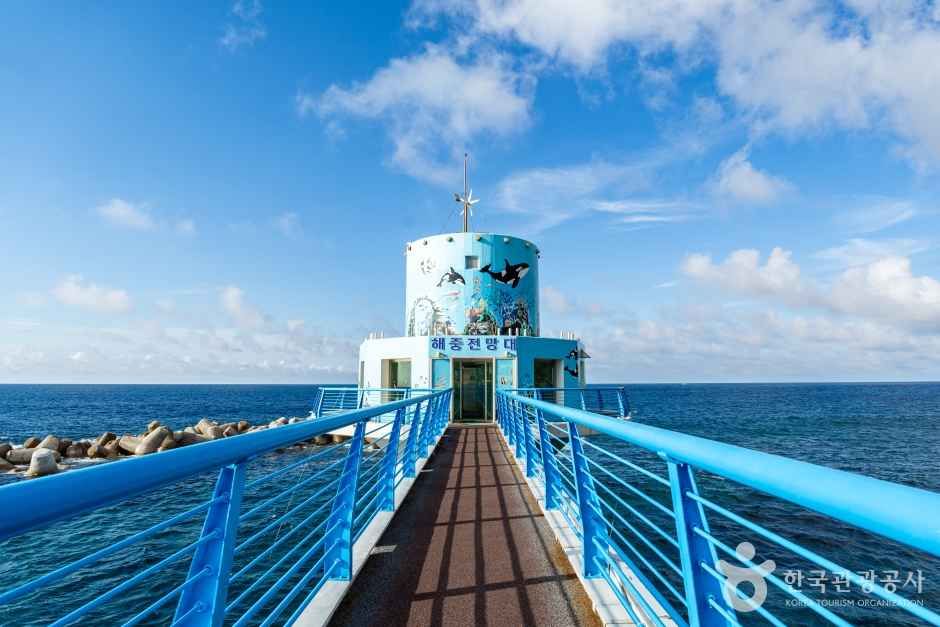 천부해중전망대는 우리나라에서 유일하게 수중에 설치된 전망대로, 울릉도의 대표적인 관광 명소 중 하나이다. 천부소공원과 연결된 다리를 따라 바다 방향으로 걸어가면, 그 끝에 원통형 구조의 천부해중전망대가 우뚝 서 있다. 전망대 내부에는 바닷속을 직접 관찰할 수 있는 전망창이 설치되어 있어, 울릉도 주변 바다에 서식하는 다양한 해양 생물들을 생생하게 감상할 수 있다. 특히 창 앞에는 먹이통이 마련되어 있어, 자연 상태의 물고기들이 모여드는 모습을 더욱 가까이에서 볼 수 있다. 마치 수족관 속에 들어온 듯한 신비로운 경험을 제공하며, 아이들과 가족 단위 관광객들에게 큰 인기를 끌고 있다. 바다 위에서 시작해 바닷속까지 이어지는 독특한 구조 덕분에, 천부해중전망대는 울릉도의 수중 생태계와 청정 해양 환경을 오감으로 체험할 수 있는 특별한 장소로 손꼽힌다. 날씨가 맑은 날에는 바다 너머로 펼쳐지는 수평선과 해안 절경이 더해져, 전망대 위에서도 뛰어난 경관을 감상할 수 있다.