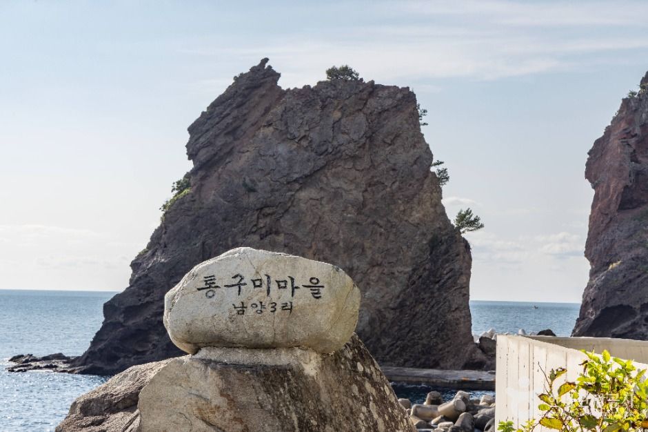 울릉군의 유일한 자연포구로, 마을 양쪽으로 골짜기가 깊고 좁아 통처럼 생겼다고 하여 통구미라 하였으며, 또한 거북 모양의 암석이 마을을 향해 기어가는 듯한 것을 보고 거북이가 들어가는 통과 같다 하여 통구미라고도 한다.