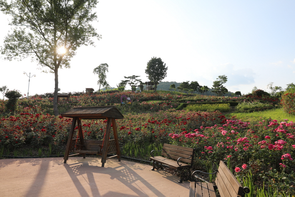 함창명주 테마파크 공원은 경북 상주시 함창읍에 자리 잡고 있다. 명주의 역사와 유래, 명주 짜기의 전통을 후세에 알리고 천연섬유인 명주의 가치를 새롭게 인식시키기 위해 건립된 명주 박물관과 한복의 아름다움을 감상할 수 있는 한국 한복 진흥원도 가까이 있다. 상주의 대표 전통산업인 함창명주의 위상을 높이고 알리기 위한 ‘함창명주 페스티벌’도 이곳에서 개최하고 있다. 18,500㎡ 규모의 장미 동산에는 20여 종의 다양한 장미꽃 품종 약 4만 그루가 100만 송이의 꽃을 피워 장관을 이룬다. 산책로도 잘 꾸며져 있어 자연과 생태, 장미 그리고 명주의 가치와 역사를 감상할 수 있는 테마 공원이다.
