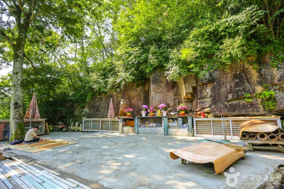 병풍처럼 지그재그로 형성된 사암질 바위면의 돌출된 모서리에 부조로 불좌상 1구와 그 양옆으로 반가사유상, 불입상, 보살입상, 공양자입상 등 30여 구의 다양한 존상들과 마애탑 1기가 얕게 선각되어 있다. 이 마애불상군은 삼국시대 양식과 특징을 가지고 있지만, 고부조의 불좌상은 수인의 좌우가 바뀌어 있는 점, 옷 주름과 광배의 어색한 조각 기법 등으로 보아, 선각 불상군은 다양한 도상들의 위치나 크기, 관계성 등 구성 원칙이 명확하지 않고, 새김의 흔적이 지나치게 선명한 불상도 있는 점 등에서 그 조성시기를 특정할 수 없다. 다만 이곳이 못이었는데, 독실한 불교신자가 배를 타고 건너가 이 바위에 부처를 조각했다는 이야기가 마을에 전해지고 있다.