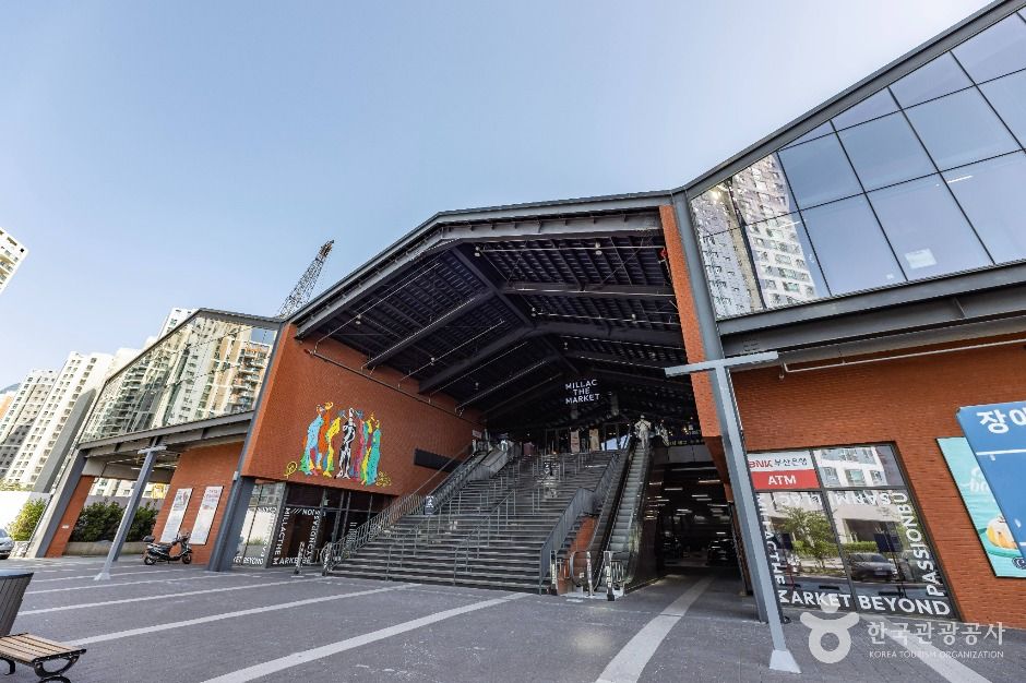 부산 수영구에 위치한 밀락더마켓은 보리에에서 운영하는 복합문화공간이다. 양옆에 에스컬레이터와 엘리베이터가 있어 편리하게 이용이 가능하다. 들어서서 보이는 벽면의 그래피티들이 인상적인 포토존 형성하고 있다. 차별화된 열린 광장형의 체험공간을 지향하는 이곳은 로컬과 문화를 연결하는 새로운 라이프스타일의 공간이며, 누구나 주인공이 될 수 있는 꿈의 무대 버스킹스퀘어와 부산바다를 느낄 수 있는 오션뷰스탠드, 수준 높은 국내외 외식브랜드를 경험할 수 있는 F&B존 등으로 공간이 구성되어 있다. 입점한 브랜드에 따라 팝업 스토어로 기간을 정해놓고 운영 중인 곳도 있기에 방문하고 싶었던 브랜드가 있다면 미리 확인해 보고 방문하면 좋을 듯하다.