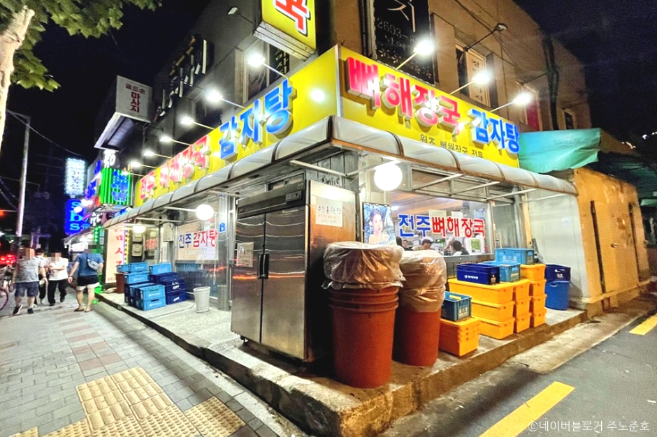 전주감자탕뼈해장국은 지하철 2호선, 5호선 까치산역 3번 출구 강서 구립 곰달래도서관 부근에 있다. 매장이 있는 상가건물에 자체 주차장은 없다. 방문 시 대중교통을 이용하거나 자동차 이용 시 주변 공영주차장을 이용해야 한다. 이곳은 우거지를 듬뿍 넣어주는 24시간 영업 해장국집으로 유명한 곳이다. 매장 안으로 들어서면 홀은 넓고 원목으로 된 무거운 테이블이 연이어 있다. 대표 메뉴는 감자탕(대, 중), 뼈해장국, 우거지 해장국이 있다. 해장국 국물은 텁텁하지 않고 시원하고 개운한 편이다. 추가 메뉴로 볶음밥이 있는데 감자탕을 먹고 마지막에 김 가루에 함께 볶음밥을 비벼 먹는 것이 인기가 많다. 주변에 봉제산, 매봉산이 있어 방문 전후에 등산 코스와 연계하기 좋다.