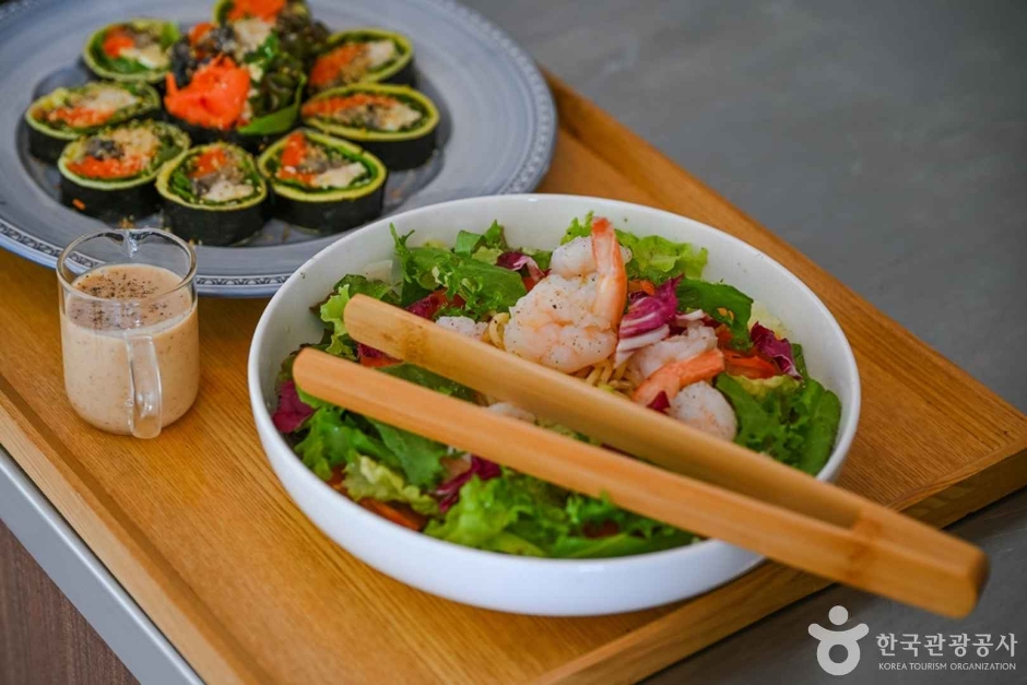 독특한 외관에 눈길이 먼저 가는 카페 곰곰(더씨앗)은 로컬 식재료를 활용한 음료와 브런치를 맛볼 수 있으며 쿠킹 클래스와 제철 과일은 활용한 카빙 체험까지 가능하다. 신선한 식재료를 활용한 브런치, 파스타, 롤, 샌드위치와 특별메뉴인 카페 곰곰이 위치해있는 옹춘의 배로 만든 배 에이드까지 즐길 수 있다. 카페 곰곰의 대표 메뉴인 ‘곰곰 롤’을 직접 만들어보는 체험도 가능하며, 체험은 별도 문의(전화)가 필요하다.