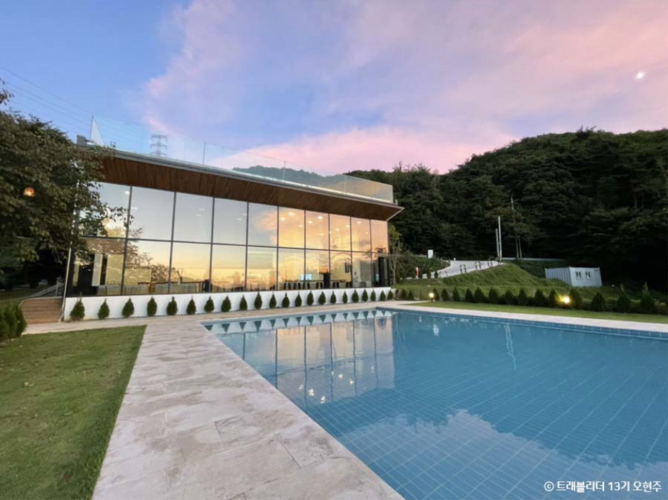 광덕산 자락에 자리를 잡아, 푸른 광덕산과 시원한 수영장 뷰로 유명한 카페다. ‘숲이 파도처럼 너울거리며 다가온다’라는 뜻의 이름을 가지고 있다. 넓은 실내에서 통창을 통해 바깥의 풍경을 한눈에 조망할 수 있다. 카페 2층의 루프탑에는 얕은 수영장과 징검다리가 설치되어 있는데 포토 존으로 유명하다. 루프탑은 안전상의 이유로 노키즈 존으로 운영 중이다.