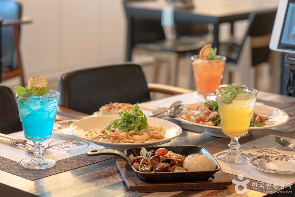 휴식레스토랑은 관광두레 주민사업체인 백제 F&B영농조합법인이 운영하는 캐주얼 다이닝이다. 휴식레스토랑은 로컬 식재료를 활용해 음식을 만든다. 청양 특산품 구기자와 청양고추를 많이 활용하고 있다. 식전에 나오는 천연발효종빵은 구기자를 활용하고, 알리오올리오 파스타의 매콤한 맛은 청양고추로 낸다. 휴식레스토랑의 인기 메뉴는 구운 야채가 곁들여진 큐브스테이크이다. 음식 판매뿐만 아니라 조리기능장과 함께하는 원데이 쿠킹 클래스도 운영하고 있다. 단지 음식을 만들어 먹는 것에서 그치는 것이 아니라, 식재료 수확, 플레이팅, 뒤처리까지 직접 체험할 수 있다.
