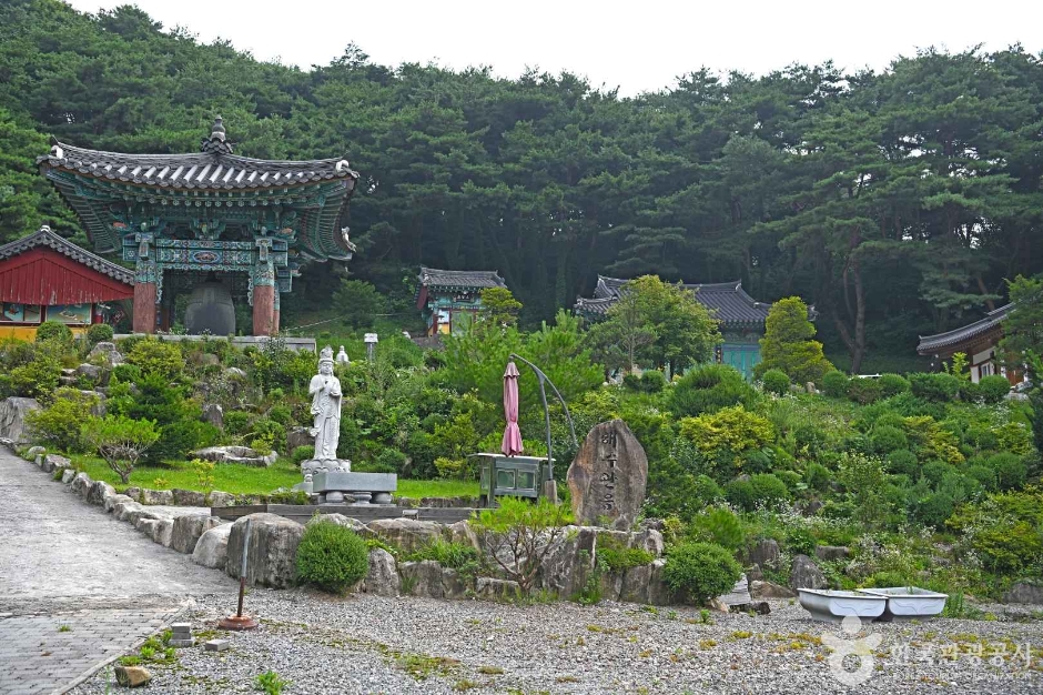 월명사의 창건은 1929년 무렵으로 송학면의 부자였던 이원성 처사가 별세하면서 자신의 별장을 사찰로 쓰게 유언을 남기면서 시작되었다고 한다. 월명사에 들어서면 수령 150년으로 추정되는 노송이 팔을 벌려 중생을 반기고, 뜰아래의 연못에는 해수관음이 세워져 있다. 단아하게 정돈된 경내에는 대웅전, 삼성각, 범종각 등의 건물들이 있으며, 대웅전에 올라서면 시원스레 산 아래 풍경이 한눈에 들어온다.