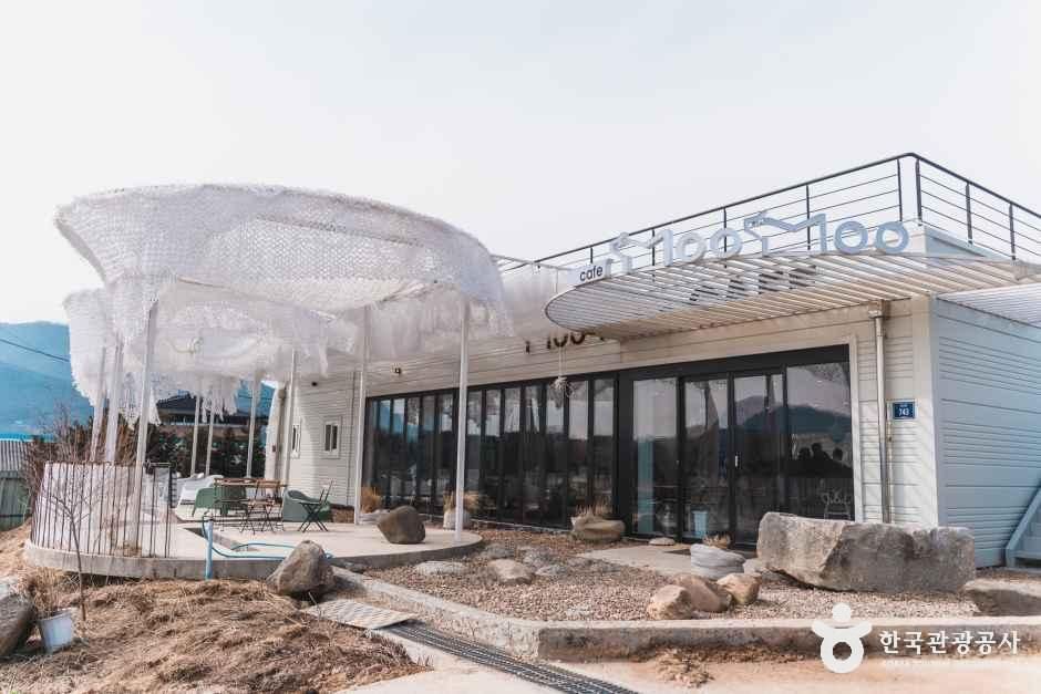 카페 무무는 충청북도 증평 도안면에 위치한 목장 겸 카페로, 매일 아침 직접 운영하는 목장에서 가져온 신선한 우유로 음료와 디저트를 만든다. 어떤 메뉴를 주문하더라도 무무아침우유가 함께 제공되는 것이 특징이다. 대표 메뉴로는 어린이부터 성인까지 즐길 수 있는 구워 먹는 치즈가 있으며, 딸기·초코·녹차·블루베리 우유와 요거트, 에이드 등 다양한 유제품 기반 음료를 판매한다. 카페 외부에는 넓은 마당과 풀밭이 조성되어 있고, 인근 목장에서 젖소와 염소, 토끼 등 다양한 동물을 가까이에서 관람하고 교감할 수 있어 아이 동반 가족 방문객에게 특히 인기가 많다. 기찻길 옆 언덕에 위치해 있어 카페에서 기차를 바라보는 색다른 풍경도 즐길 수 있다. 인근 벨포레 리조트와 가까워 함께 연계해 방문하기에 좋다.